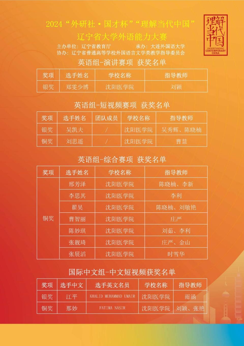 共有11个学院的199人次报名不同赛项比赛,创近年来外语类学科竞赛规模之最。通过跨学院、跨专业的竞赛、交流,不仅拓宽了沈医学子视野,更为他们职业发展奠定了坚实的基础。