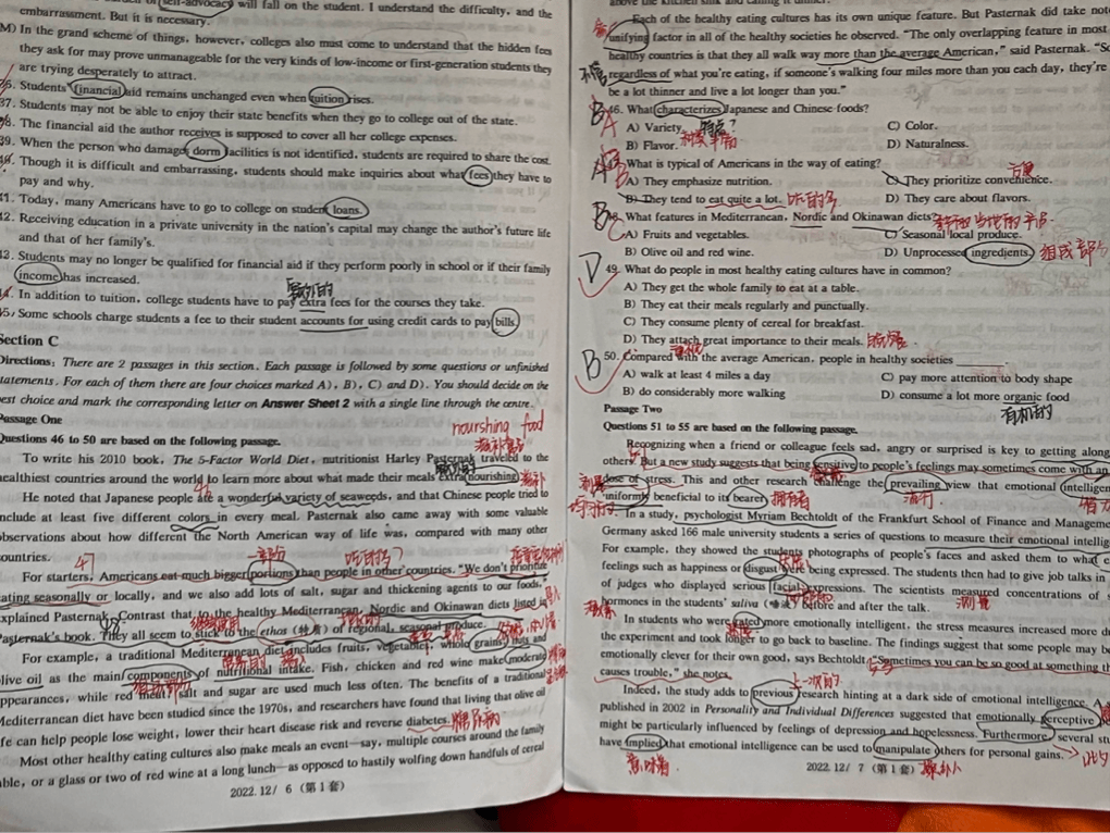 听力方面是学生的薄弱环节。老师们要求学生边听边读,利用四级的真题听力,边听边读,找到英语语感。读完后,再用手机录音,最后对照原文听力找差距。反复进行此过程,以达到听说能力同步提高。此外可进行精听练习,通过多次听写同一段材料,力求逐字逐句听懂,不知不觉听力水平就会有所进步。